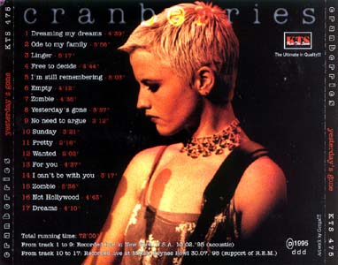 YESTERDAY'S GONE Manufacturer: KTS Catalog: KTS 475 (71:44) Tracklisting : 1. Dreaming My Dreams 2. Ode To My Family 3. Linger 4. Free To Decide 5. I'm Still Remembering 6. Empty 7. Zombie 8. Yesterday's Gone 9. No Need To Argue 10. Sunday 11. Pretty 12. Wanted 13. For You 14. I Can't Be With You 15. Zombie 16. Not Hollywood 17. Dreams Sources : (1-9) February 13, 1995. New York (Acoustic) (10-17) July 30, 1995. Milton Keynes Bowl Sound Quality : (1-9) Excellent Soundboard (10-17) VG Soundboard